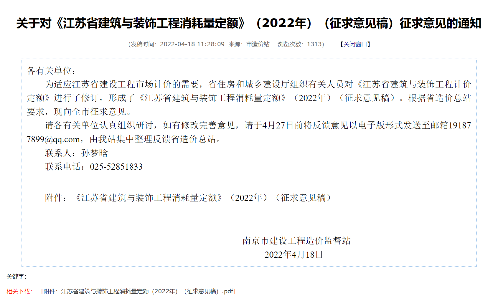 轉(zhuǎn)發(fā)關(guān)于對《江蘇省建筑與裝飾工程消耗量定額》(2022年) (征求意見稿) 征求意見的通知,其下載連接如下所示: