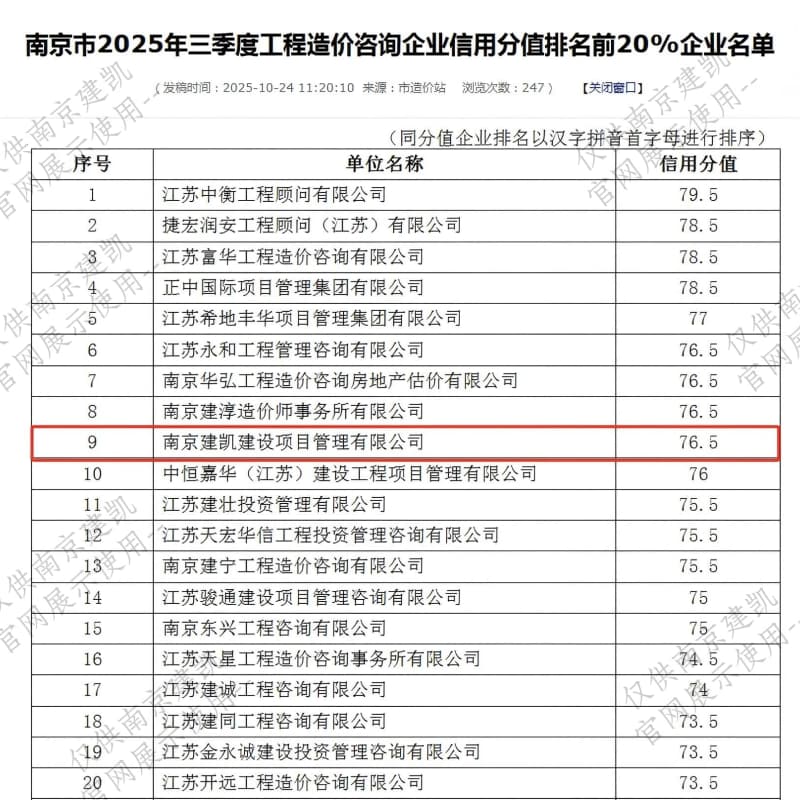 恭喜我司入選“南京市2025年三季度工程造價咨詢企業(yè)信用分值排名前20%企業(yè)名單”