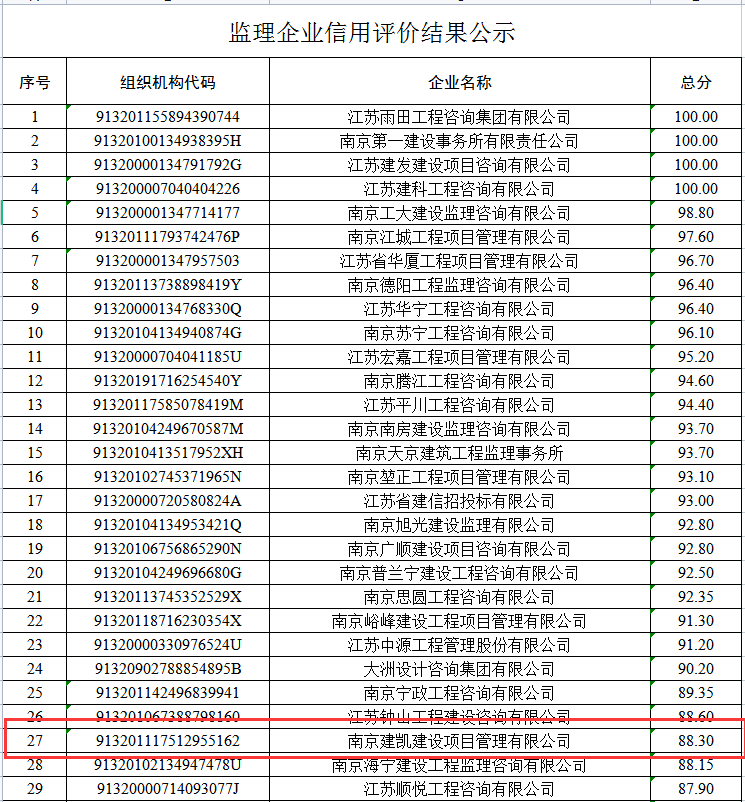 (2023年8月21日)市建委《2023年上半年南京市建設(shè)工程監(jiān)理企業(yè)信用評價結(jié)果公示》