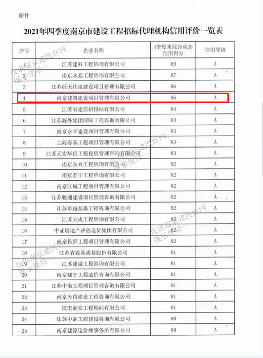熱烈祝賀我司招標(biāo)代理在“2021年四季度南京市建設(shè)工程招標(biāo)代理機(jī)構(gòu)信用評價(jià)”中榮獲A級。