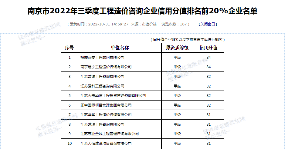 恭喜我司造價部入選“南京市2022年三季度工程造價咨詢企業(yè)信用分值排名前20%企業(yè)名單”