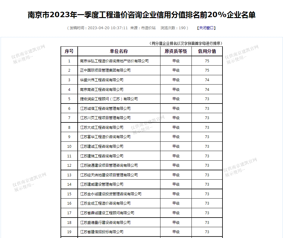 恭喜我司入選“南京市2023年一季度工程造價咨詢企業(yè)信用分值排名前20%企業(yè)名單”