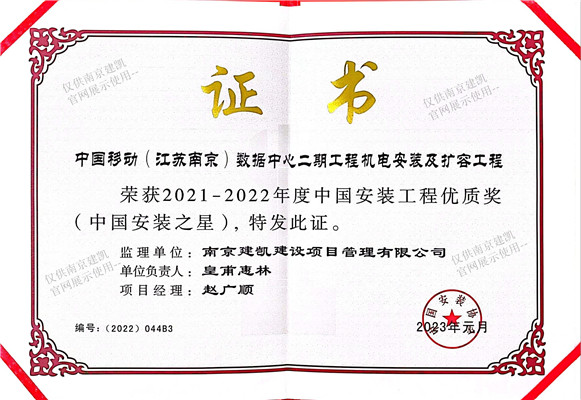 熱烈祝賀我司中國(guó)移動(dòng)(江蘇南京)數(shù)據(jù)中心二期工程機(jī)電安裝及擴(kuò)容工程監(jiān)理部榮獲“2021-2022年度中國(guó)安裝工程優(yōu)質(zhì)獎(jiǎng)”