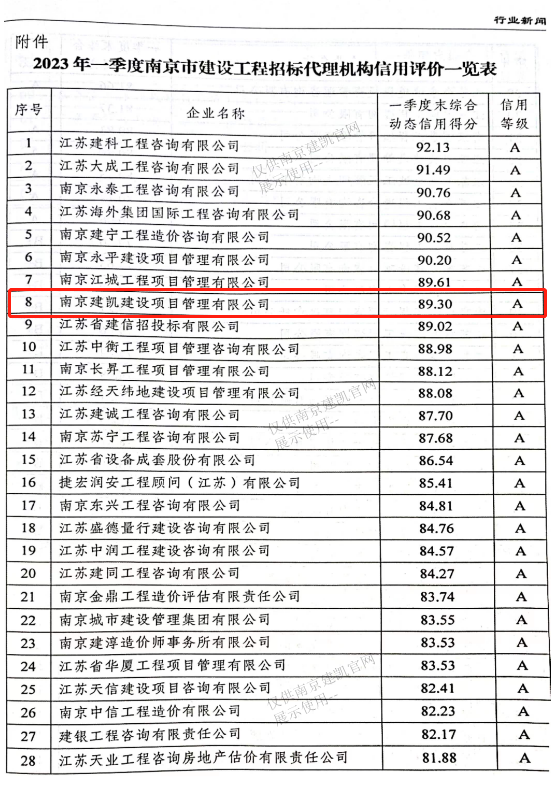 熱烈祝賀我司招標代理機構(gòu)在2023年第一季度南京市建設(shè)工程招標代理機構(gòu)信用評價綜合得分89.30分,全市排名第八名