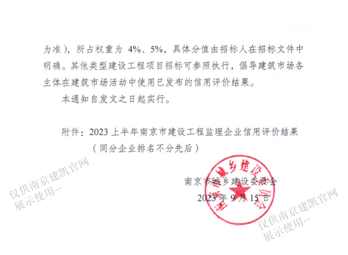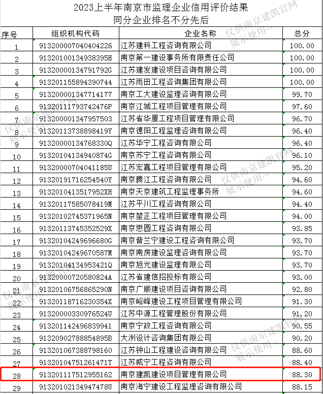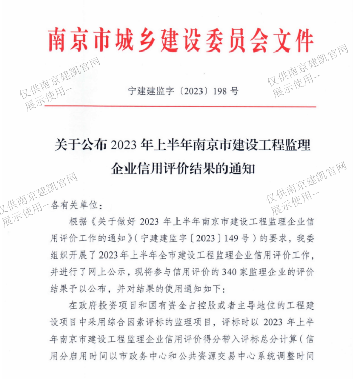 我司監(jiān)理企業(yè)在2023年上半年南京市建設工程監(jiān)理企業(yè)信用評價綜合得分88.30分