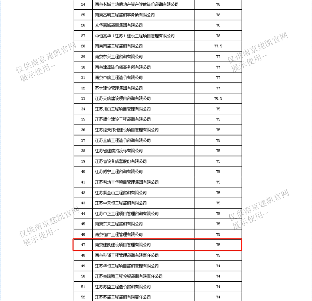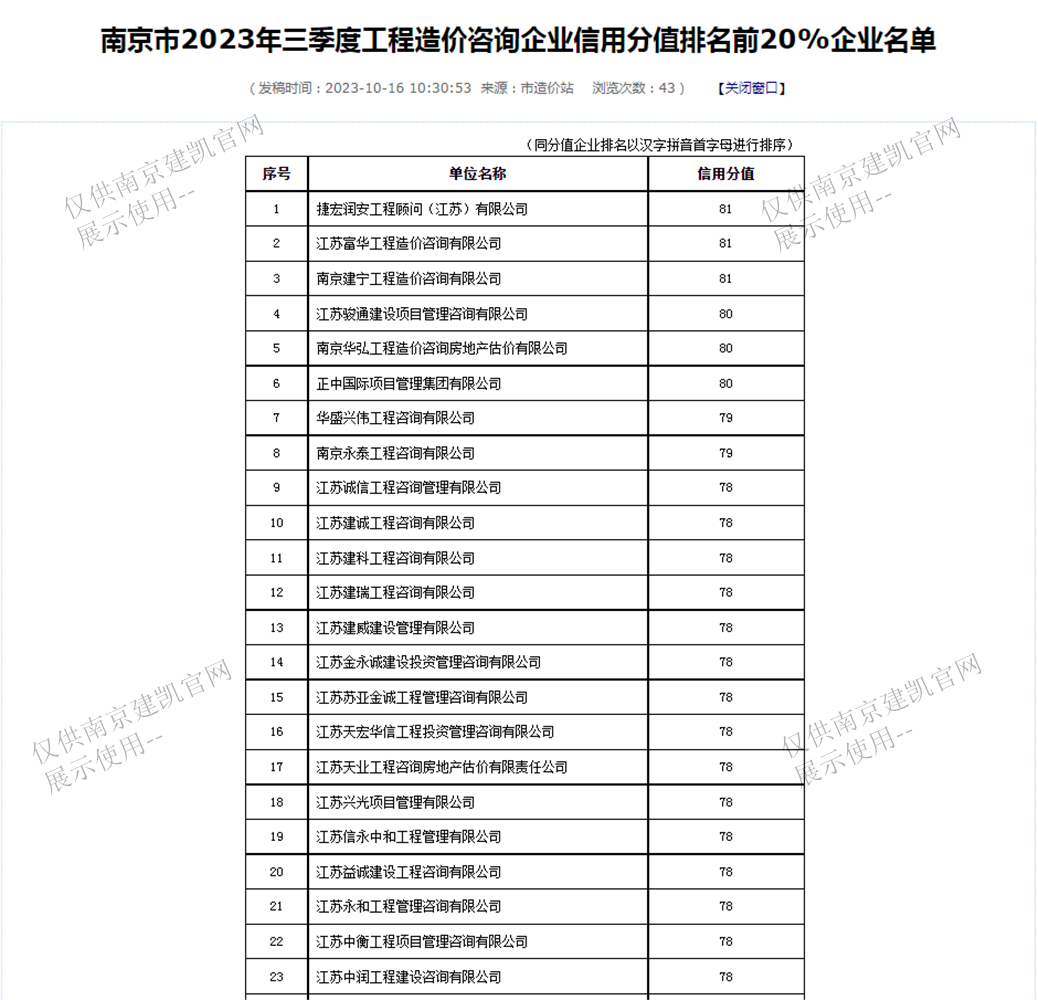 恭喜我司入選“南京市2023年三季度工程造價咨詢企業(yè)信用分值排名前20%企業(yè)名單”