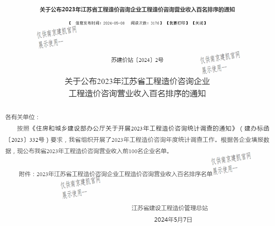 熱烈祝賀我司榮獲“2023年江蘇省工程造價咨詢企業(yè)工程造價咨詢營業(yè)收入前百名企業(yè)”
