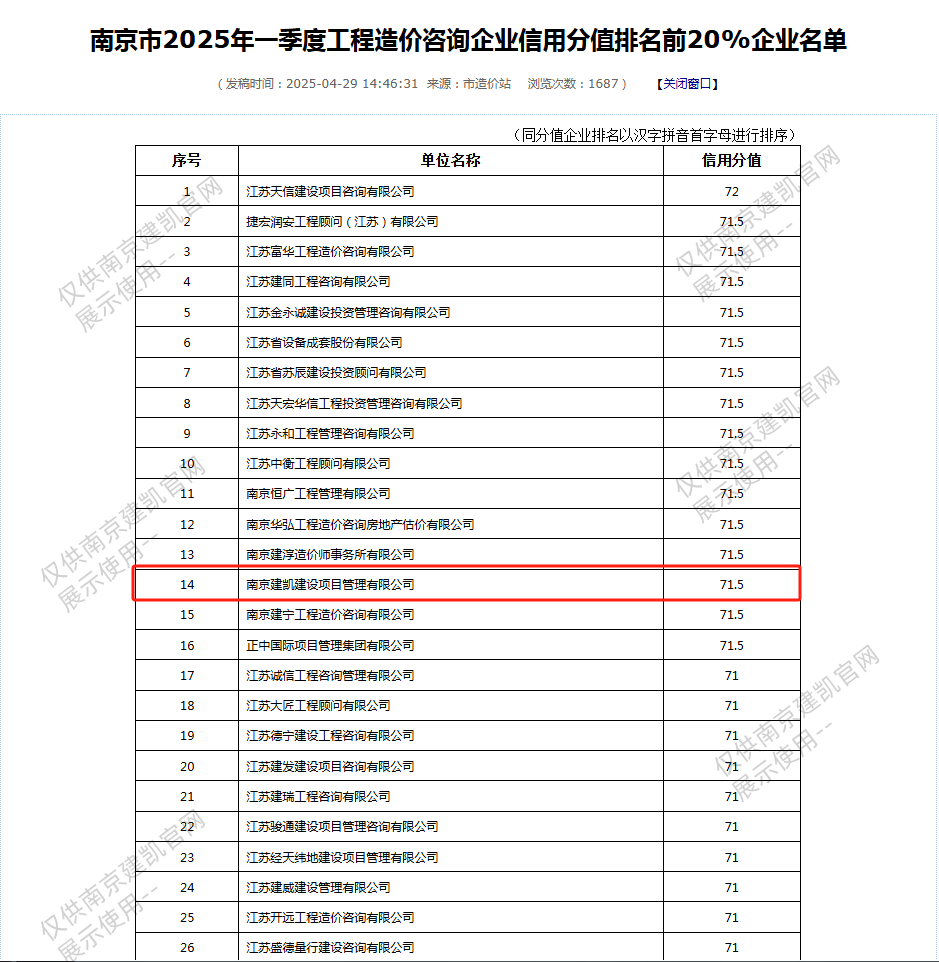 恭喜我司入選“南京市2025年一季度工程造價(jià)咨詢企業(yè)信用分值排名前20%企業(yè)名單”