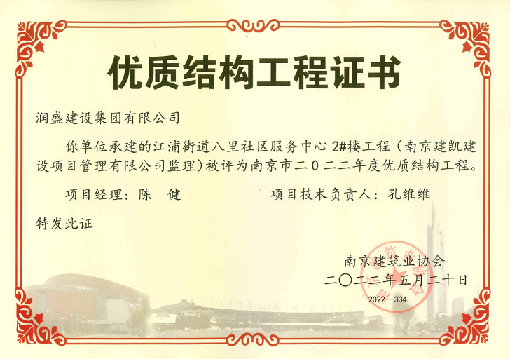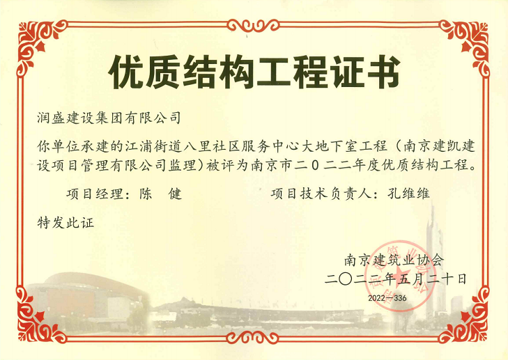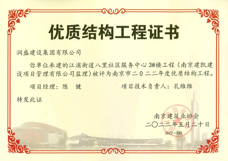 (2022年05月20日)江浦街道八里社區(qū)服務中心項目榮獲《南京市2022年度優(yōu)質(zhì)結構工程》