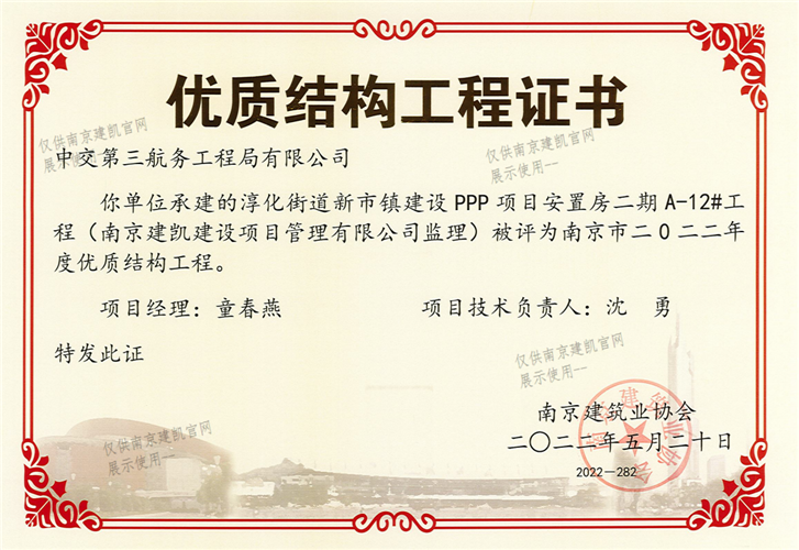 南京市二0二二年度優(yōu)質(zhì)結(jié)構(gòu)工程(淳化街道新市鎮(zhèn)建設(shè)PPP項(xiàng)目安置房二期A-12#工程)