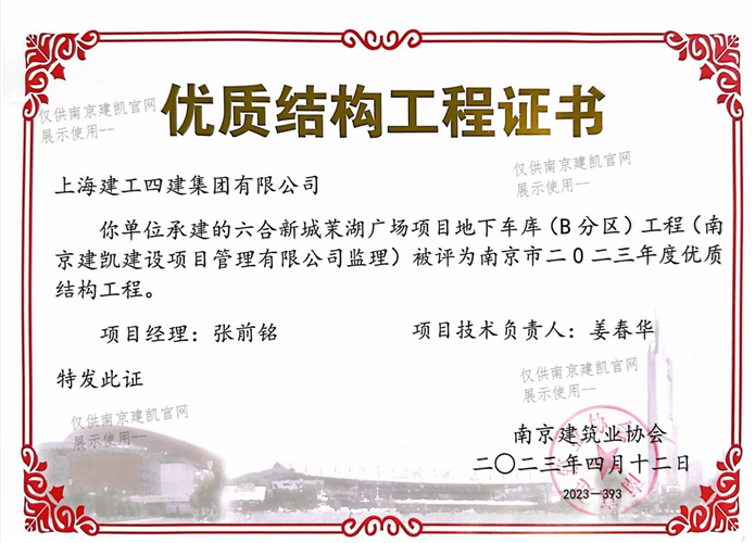 南京市二0二三年度優(yōu)質(zhì)結(jié)構(gòu)工程(六合新城茉湖廣場項(xiàng)目地下車庫工程)